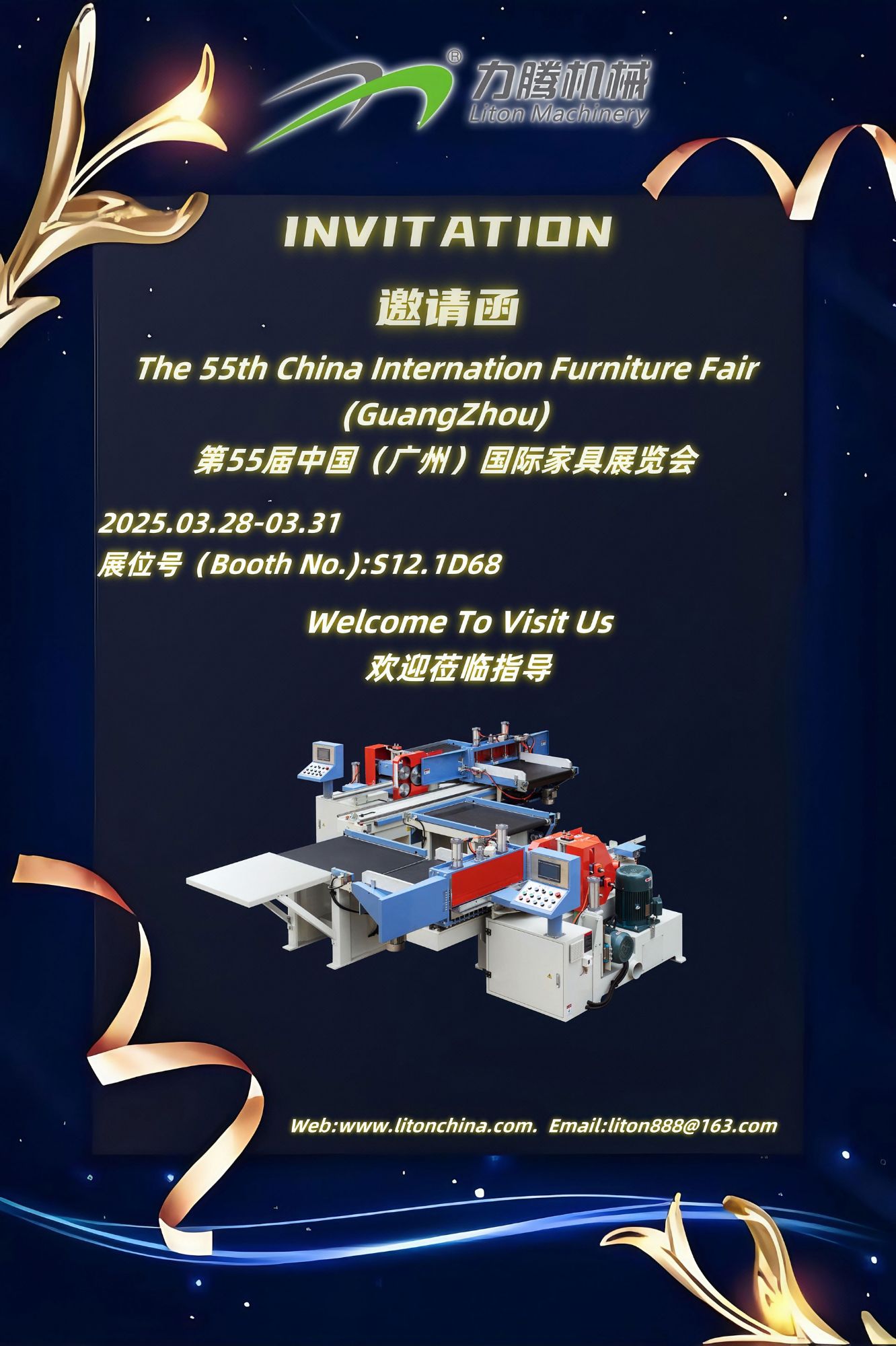 力騰機(jī)械誠摯邀請您參觀第55屆中國國際家具展覽會(廣州),本次展會將于2025年3月28日至31日在廣州盛大舉行。我們將在展位號S12.1D68恭候您的光臨,期待與您共探行業(yè)前沿技術(shù),分享創(chuàng)新解決方案!